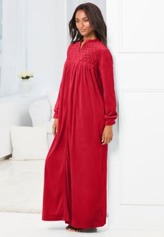 We carry a variety of beautiful robes in a range of different styles, colors, and patterns. For a gorgeous variation on traditional tie-front robes, wrap yourself in our Long Embroidered Bell Sleeve Robe. It features a zip front, plush velour fabric, and feminine bell sleeves with floral embroidery.