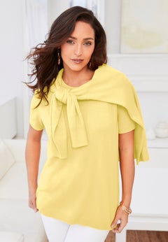 We adore the Slit Sleeve Blouse by ellos®. This flowing top has a beautiful draped design in the front that creates an elegant aesthetic. Pair it with everything from tailored shorts and jeans to dress pants and leather leggings. We could totally see this with a pair of edgy ankle boots or strappy heels from our shoe collection for a fresh take on styling your plus size cold-shoulder tops.