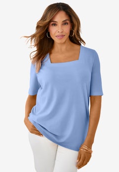 Our Square Neck Tees can be dressed up for work and have an interesting neckline to give it a fresh new feel. This top comes in a range of colors to brighten up your weekday wardrobe. Pair it with ankle pants from our bottoms shop for a chic look. We recommend the Tummy Control Twill Ankle Pant.