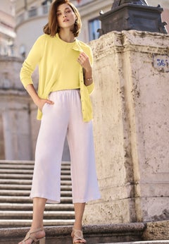 Crochet, sheer, chunky, slouchy, and cutout plus size cardigans are more casual than their tailored and solidly crafted counterparts. With that in mind, we suggest trying an option like our Open-Front Cardigan. This knit cardigan has a fastener-free front that’s been designed with a clean, modern front for a more professional feel. Pair this with our Sleeveless Swing Tunic and Tummy Control Twill Ankle Pant for a winning trio.