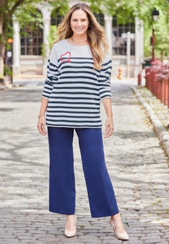 Whether you’re dressing for work, a night out, or need a warm and stylish dressy plus size sweater for a holiday party, then you’re in the perfect place. Try our Peplum Bell-Sleeve Sweater for a trendy and beautiful take on dressy tops. It has a figure-flattering cut with stylish and feminine bell sleeves. Pair it with a pencil skirt or dress pants and a pair of heels or dressy flats from our shoe shop.