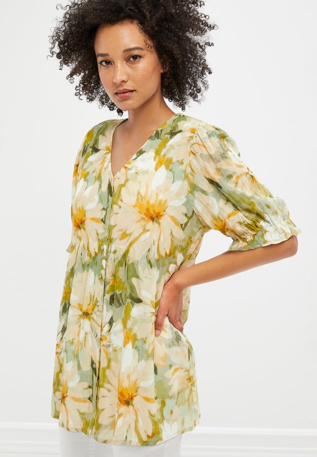 With so many stylish details – ruffled sleeves, elastic cinching at waist, pearlized buttons –this tunic makes the outfit. Just pair it with skinny jeans or white pants for an instantly fashionable, casually feminine look.