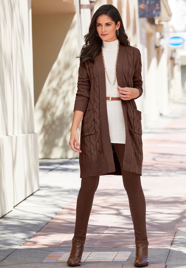 This classic sweater duster is a must-have for fall-forward style. The cable knit detailing adds a soft, textural touch while the shawl collar lends eye-catching appeal. The relaxed fit is figure flattering and effortlessly pairs over everything in your wardrobe.