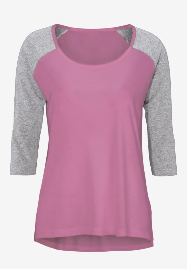 Tee with color blocking on 3/4 sleeves. Ballet neckline. Curved high/low hem.