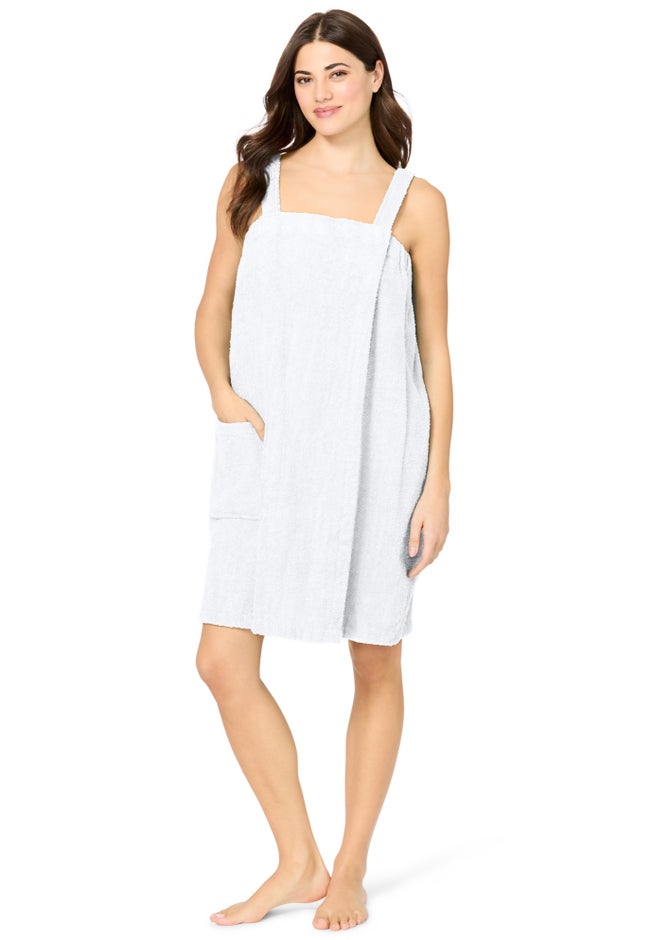 A robe and towel all in one, this towel wrap does double duty while allowing hands-free drying as you step out of the shower or bath. Shoulder straps plus an elastic top band keep it in place without the risk of slippage while soft terry fabric absorbs water and keeps you comfy. Made with a front Velcro closure for easy on, easy off.