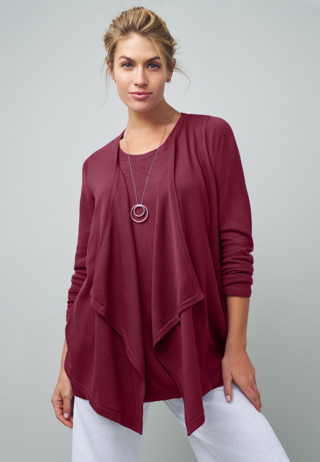 Item Number: 1061945The Jessica London women's plus size Flyaway Cardigan is the perfect sweater to style over a tank and jeans. Features set-in sleeves with ribbed cuffs and hem.
