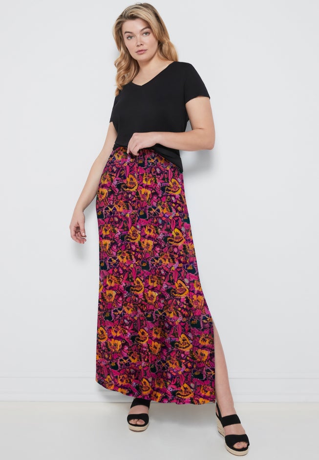Skirt has elastic drawstring waist and side slit. Slight A-line silhouette.