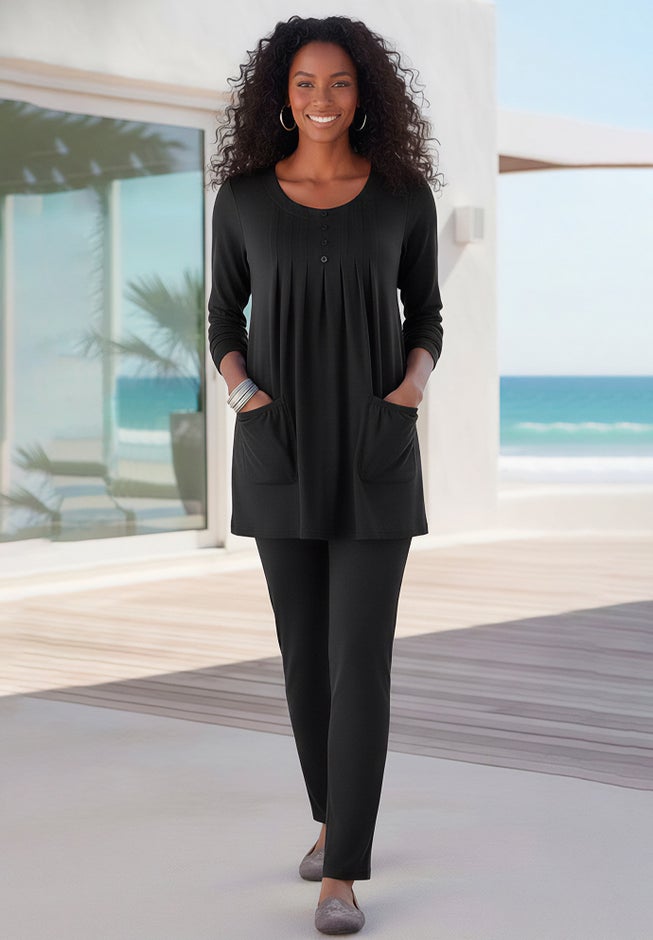 We gave this top two pockets and decorative buttons for a little extra style. It's shaped to suit you with front pleats and a 34" tunic length that's just right for wearing over your favorite bottoms. Loose yet stylish, this is sure to be a favorite.