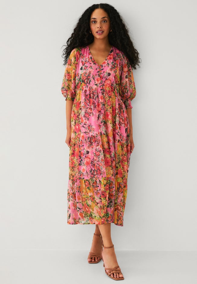 This sheer tiered midi dress gives you flowing movement with a softly structured feel. Sheer sleeves and lightweight layers add dimension, while hidden elastic keeps the fit comfortable. Flat sandals feel right for daytime events, while heels and a sleek clutch create an evening-ready look.