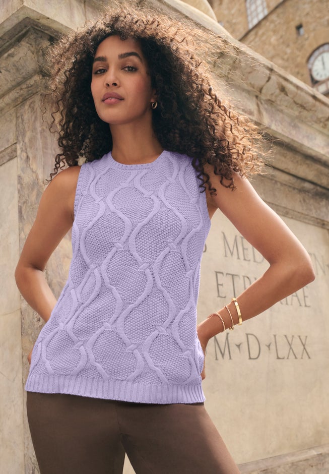 Item Number: 1108983Polished and sophisticated in a classic cable knit, the Jessica London women’s plus size Sleeveless Cable Shell is crafted in a flattering straight silhouette. Pair it with the matching Elbow Sleeve Cable Cardigan for a coordinating look that always delivers.
