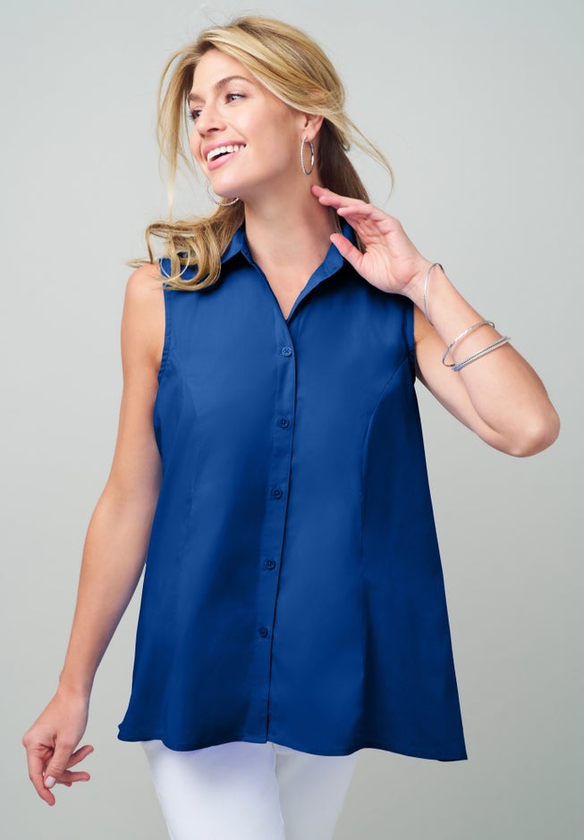 Elevate your closet with this crisp poplin sleeveless shirt. Polished and chic, this top features a flattering, flow silhouette and is dressed up with a collar. Layer with a cardigan, or pair it with a skirt or slacks.
