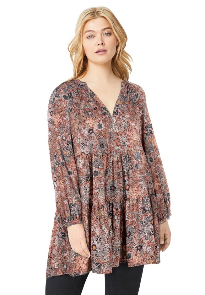 This two-tier, A-line tunic adds a light, femme look to your fall wardrobe.  Blouson sleeves feature stretch cuffs you can push up when you’re feeling casual.