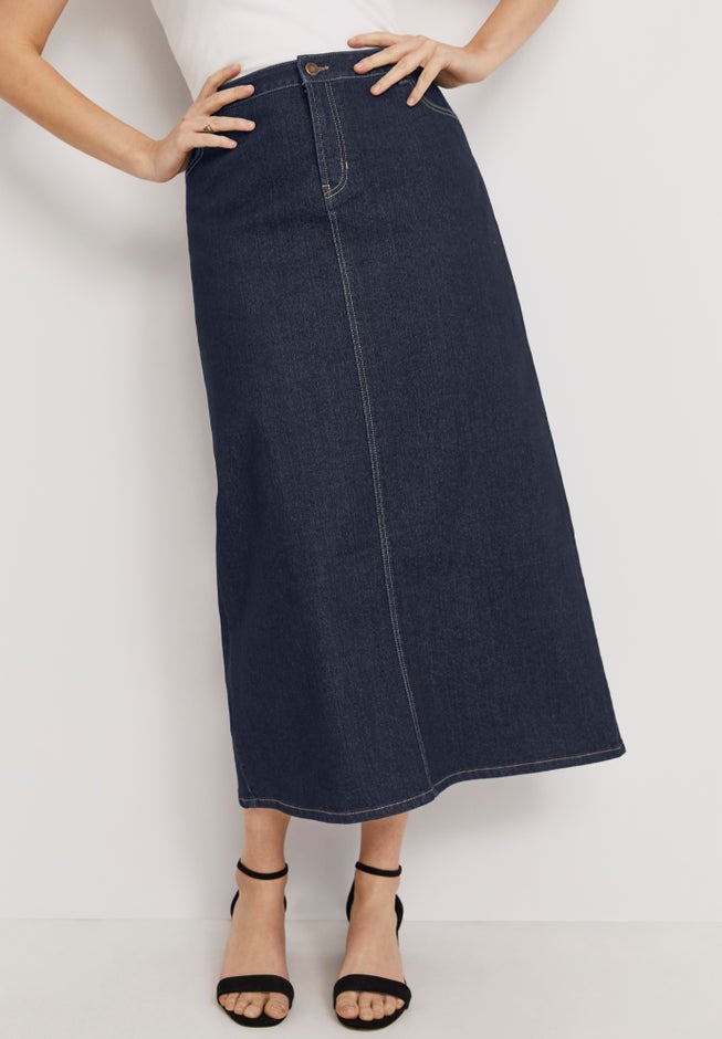 Item Number: 1037392A polished denim midi skirt designed to flex comfortably while?maintaining?a clean, structured look, making it an easy choice for workdays, weekends and casual occasions.
