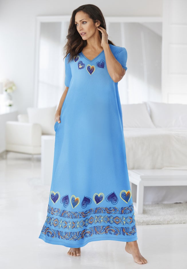 Sentence 1:  This Dreams & Co® women’s maxi lounge dress delivers effortless comfort and relaxed style, featuring a flattering V-neck, short sleeves, and an easy trapeze silhouette designed for all-day wear at home or on casual outings. With a soft cotton-blend fabric, added mobility, and thoughtful details like pockets and side slit, it offers a comfortable, confidence-boosting fit that moves with you.